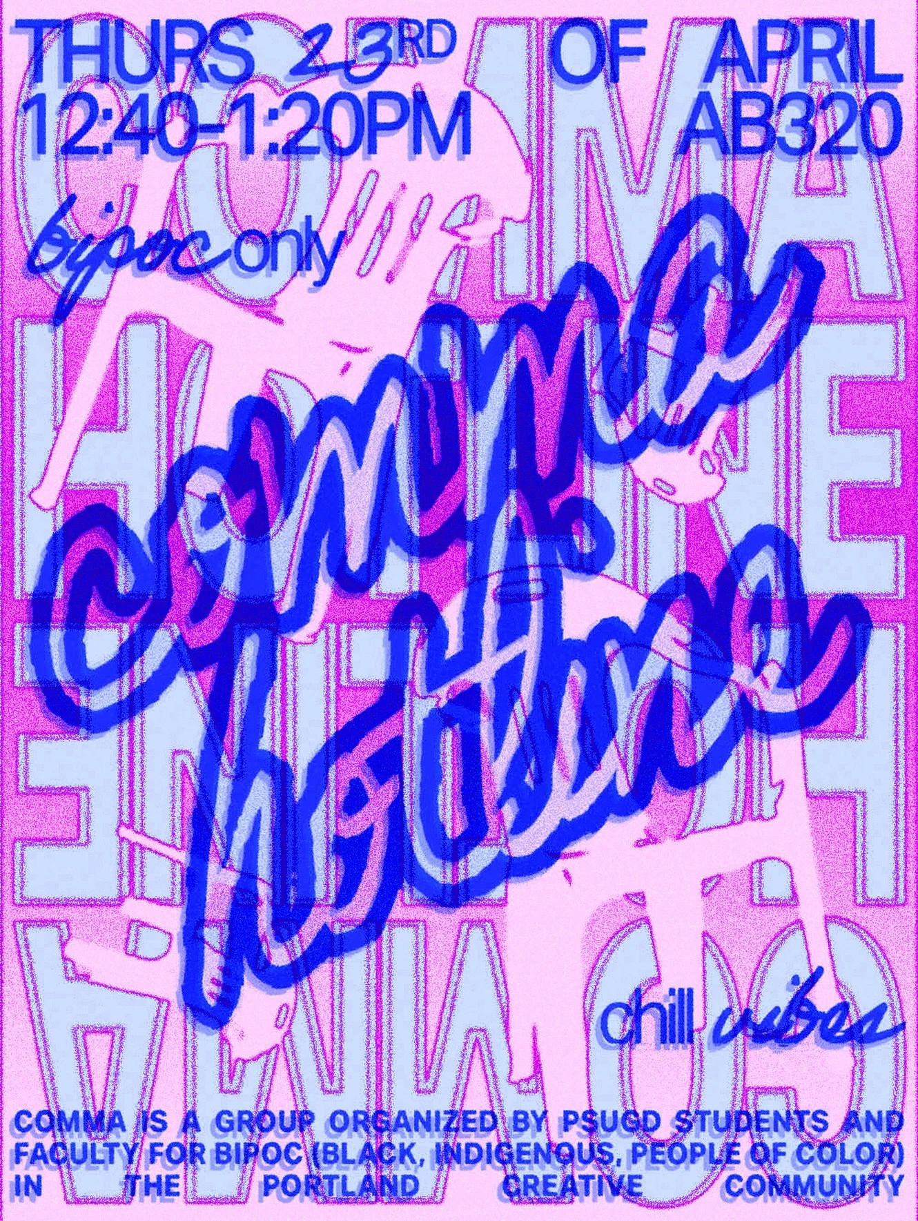 Comma is a space for BIPOC students to create connections, share experiences, learn from one another and have fun. Advised by faculty Deidra McKnight and Stephen Lee, Comma is a fluid group, directed by student interest—their academic, creative and/or social needs. Comma meets periodically during the academic year with pop-up special events for the wider BIPOC creative community in Portland.