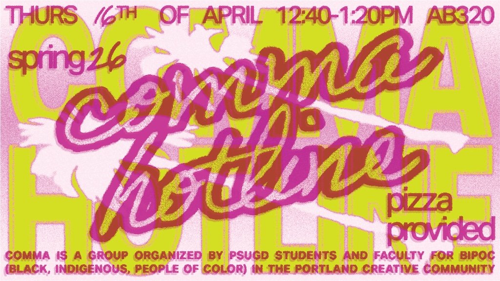 What’s COMMA? COMMA is a group organized by & for BIPOC in the graphic design program here at PSU. We’re a space for BIPOC students to create connections, share experiences, learn, and have fun! Find out more about us @psugd_comma! Pizza and snacks will be provided.