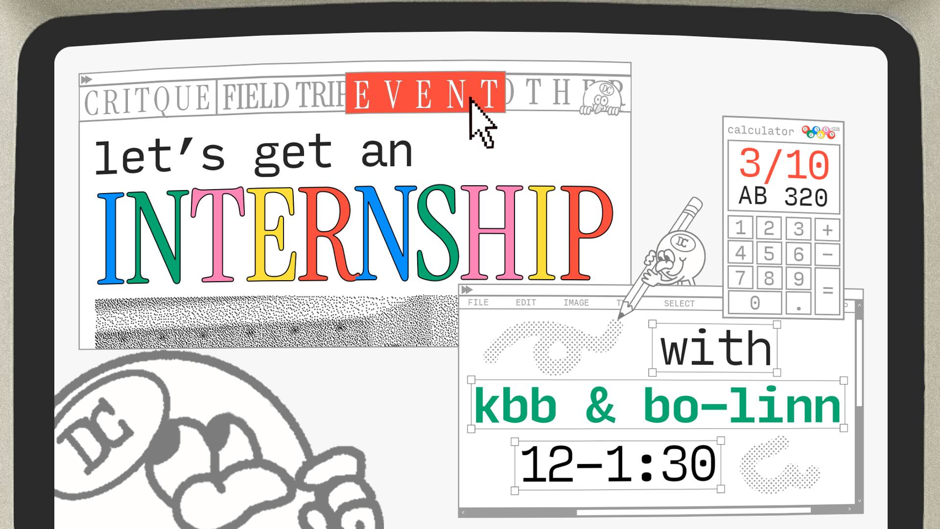 Design Club will be hosting an internship workshop with special guests— our very own— Kate Bingaman-Burt and Isabel Bo Linn!
