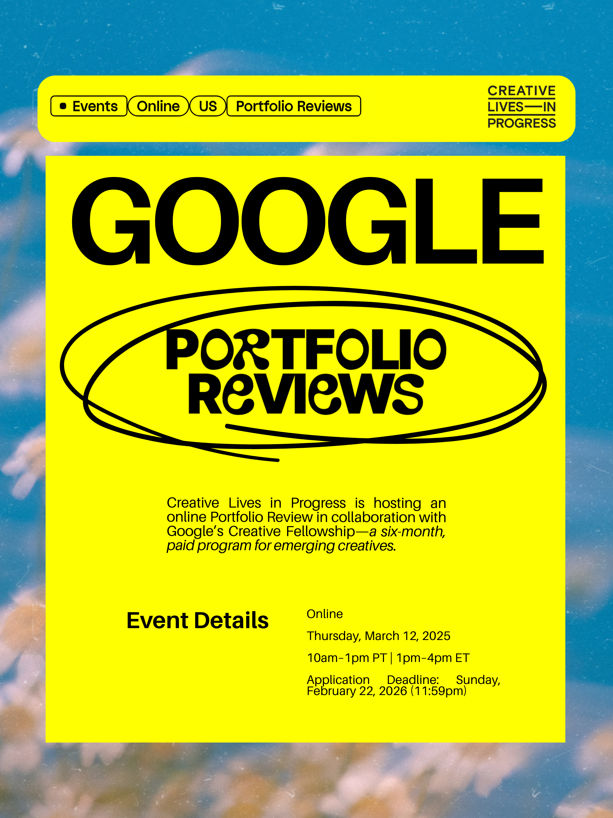 This March, Creative Lives in Progress is hosting an online Portfolio Review in collaboration with Google’s Creative Fellowship—a paid, six-month program for emerging creatives. 👀