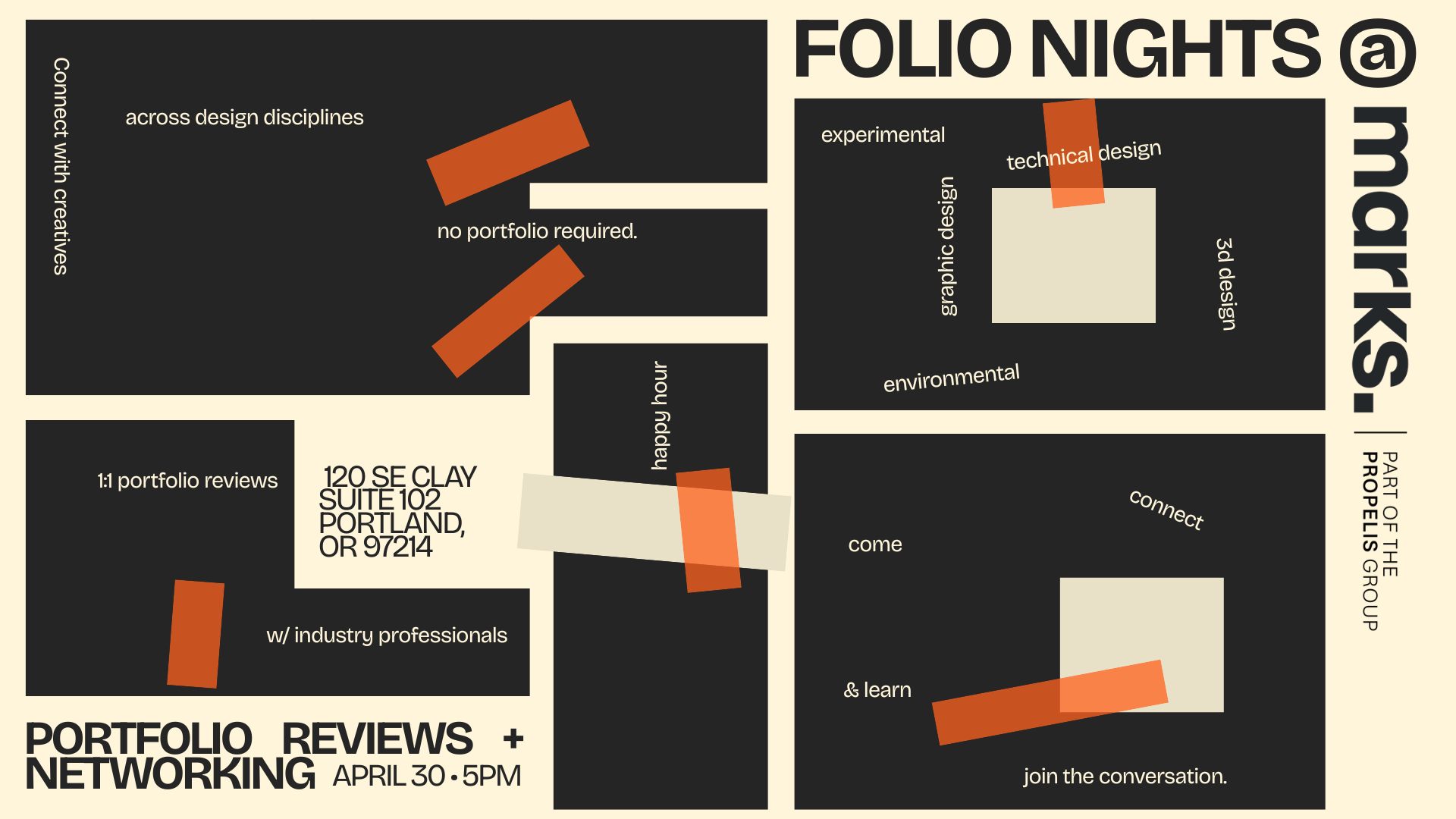 “Folio Nights” invites emerging creatives to connect directly with the Marks team through 1:1 portfolio reviews across Experiential, Graphic, Technical, 3D, and Environmental Design. The evening will also include talks and casual conversations with industry professionals.