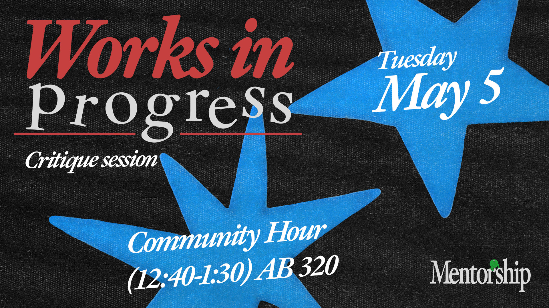 It's time to get feedback on your projects and start building your portfolio deck, but you're not alone! Mentorship is hosting a critique event happening during Community Hour (12:40-1:30) in AB320. Bring what you have and get valuable critique from your class mentors and faculty team.